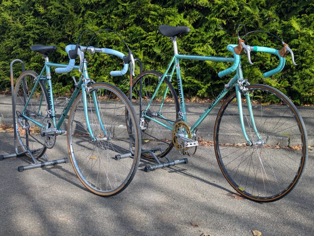 Zwei Bianchi Rekord – Stahl-Partner. Ein kleines und ein großes in Celeste! Und ab da war der Beweis angetreten, dass es mehere Grale geben muss! Find´ das erstmal genau so! Zwei Bianchi, die so gut zu einander passen. Ein kleines und ein großes Bianchi! Pure 70er in Stahl! Aber…