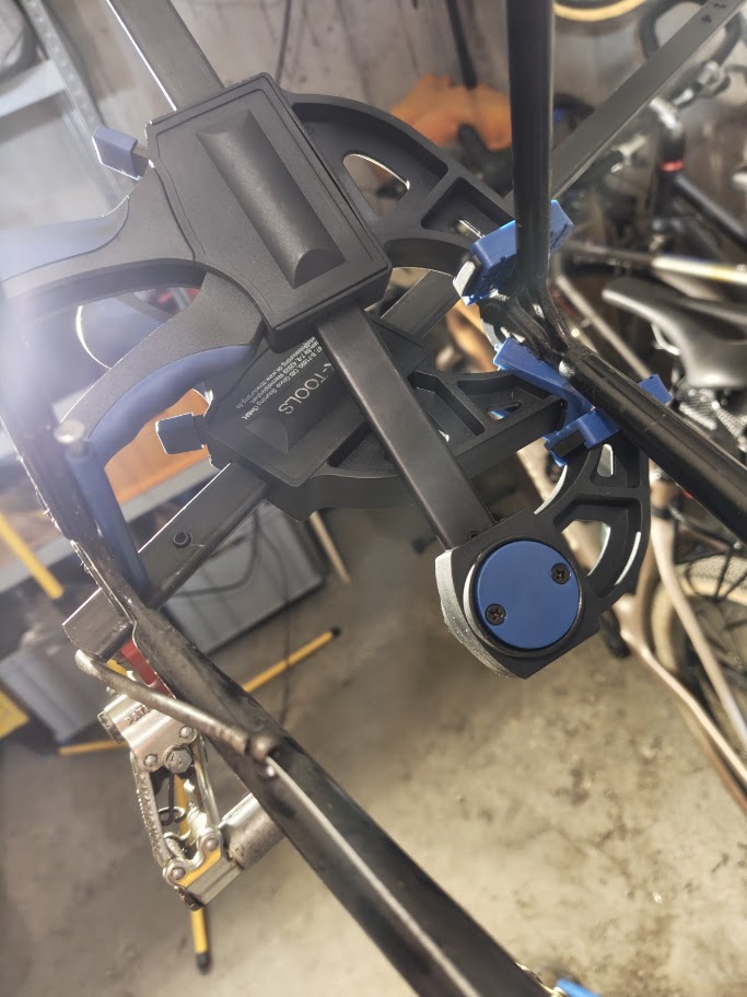Zum Weiten kann man eine Gewindestange nehmen, oder in meinem Fall, mit Zwingen. Da sich der Druck zu beiden Seiten gleichmäßig vereilt, reicht es, dass der weitende Druck etwa eine Nacht auf den Rahmen wirkt. Beim Lösen der Zwingen springt der Rahmen wieder etwas zurück, aber nicht mehr auf die Weite von 126 mm, sondern auf etwa 135 mm.